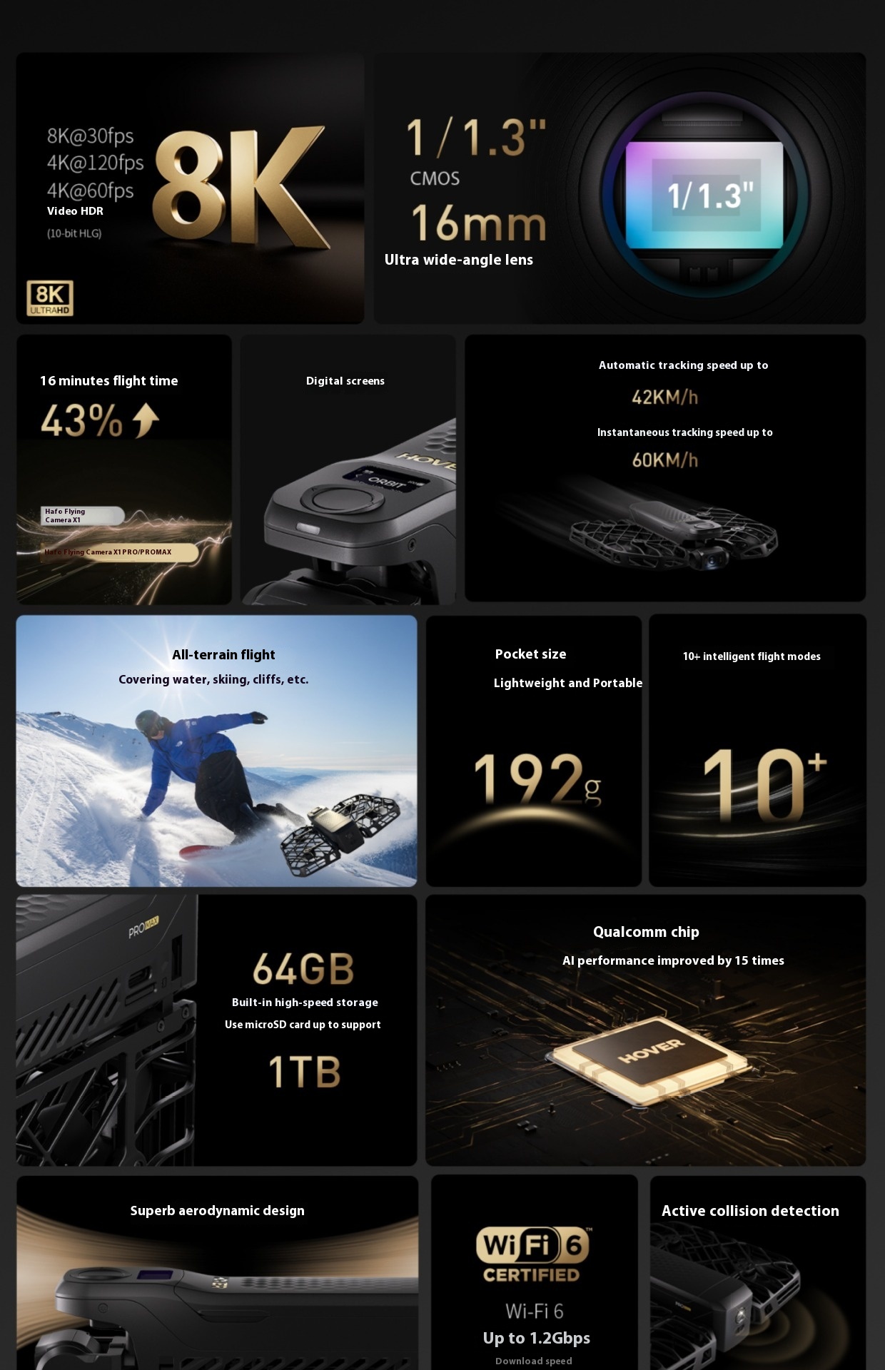 Features: intelligent AI follow-up, voice control, selfie HD anti-shake